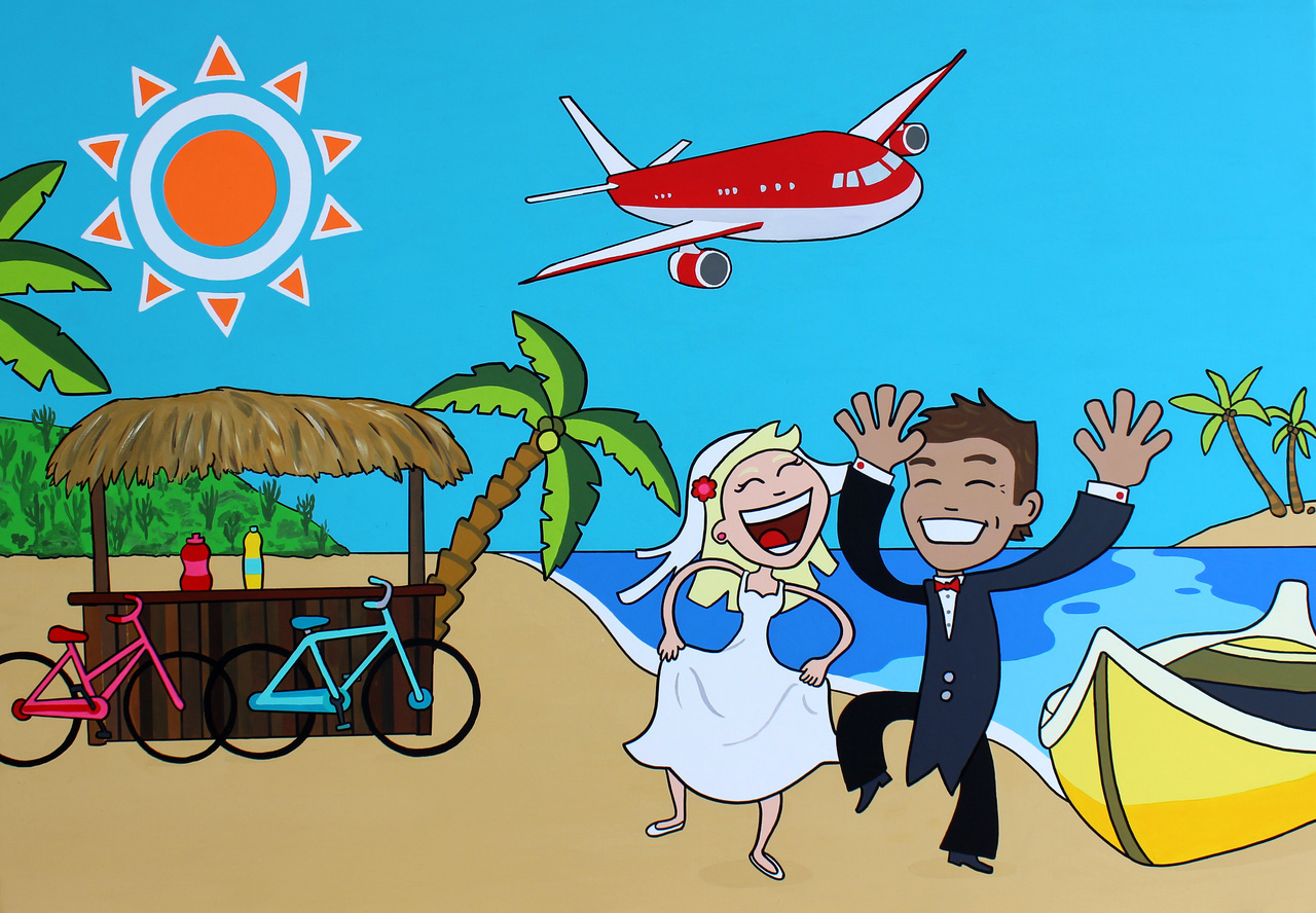 Zon Strand Acryl Liefde Vliegtuig Painting Samen Fietsen Romantisch Geluk Huwelijk Blij Boot Married Curacao Palmbomen Trouwen Gallery Artwork Couple Huwelijksbootje Modernekunst Kleurrijkekunst Vrolijkekunst Caribbeanart