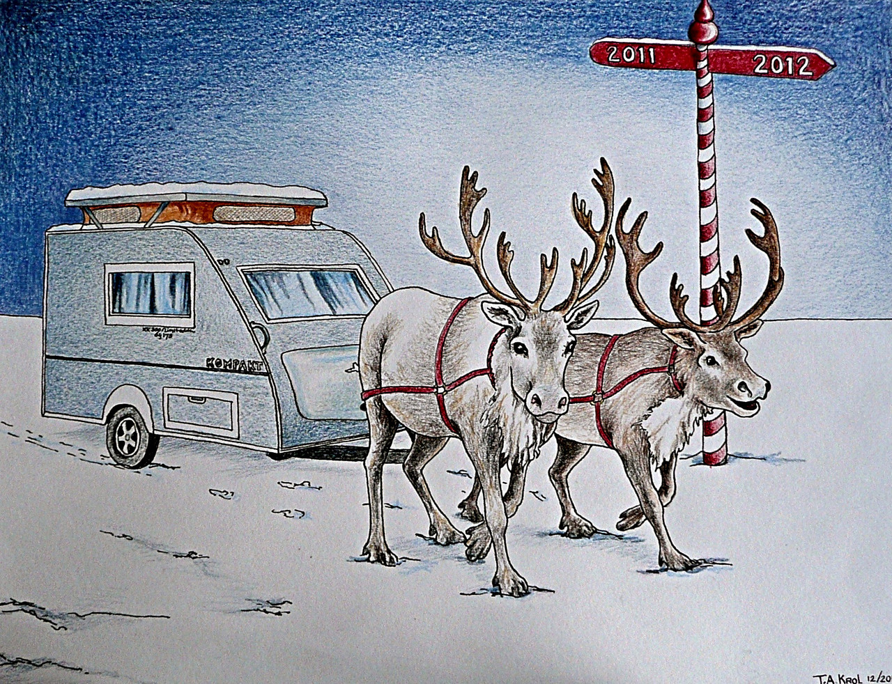 Kerstkaart 2011, caravan getrokken door rendieren