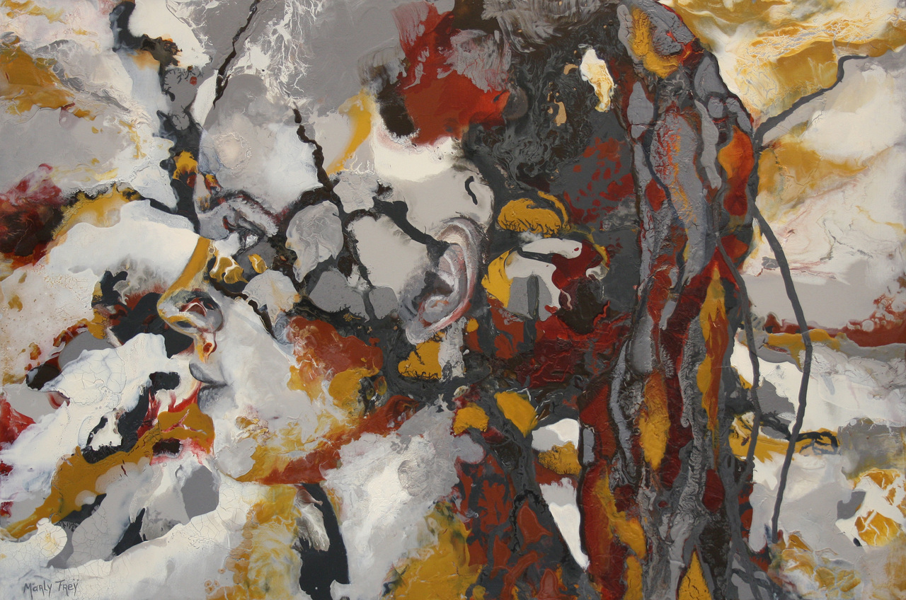 Marly Freij maakt grote kleurrijke, maar ook meer ingetogen schilderijen in gemengde techniek, met name sferische landschappen en abstracte composities