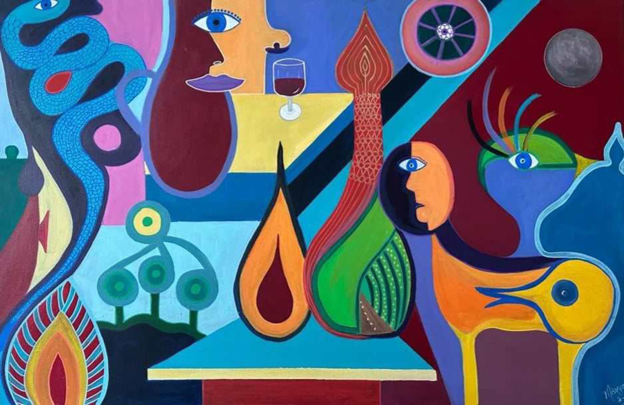 Een verhalend schilderij waarbij de kijker zelf mag bepalen wat hij/zij het vindt voorstellen. Verveelt dus nooit.