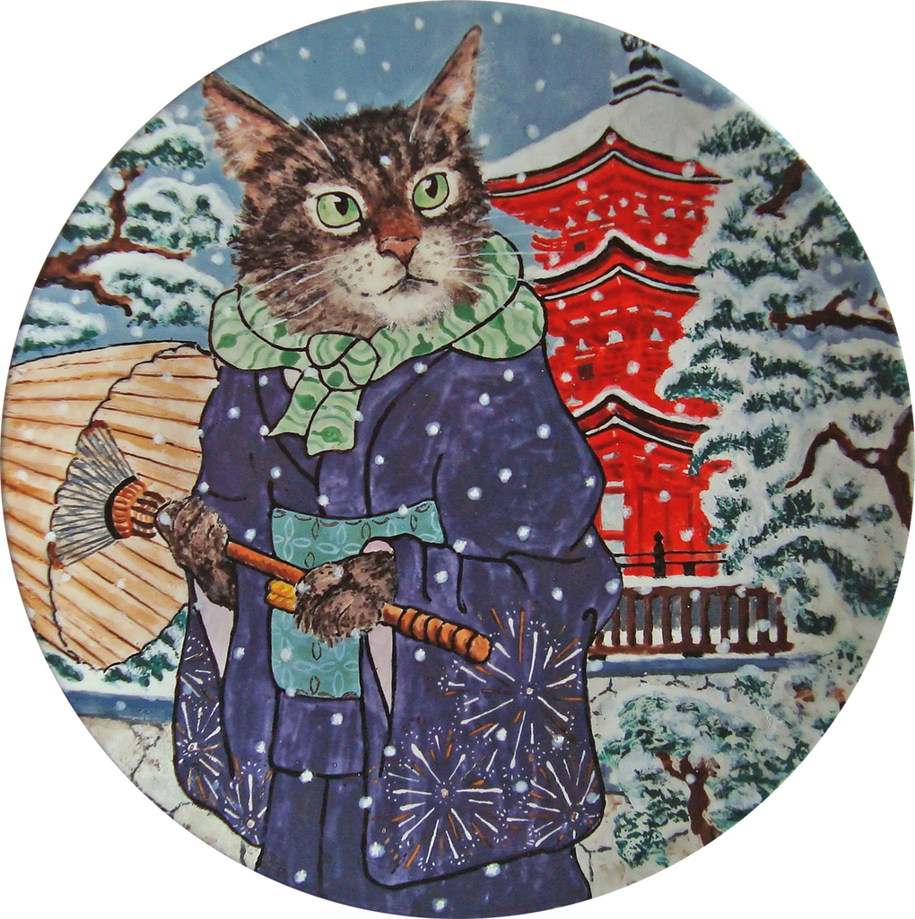 Kat Sneeuw Winter Cat Keramiek Japan Glazuur Pagode Snow Ceramics Wandbord