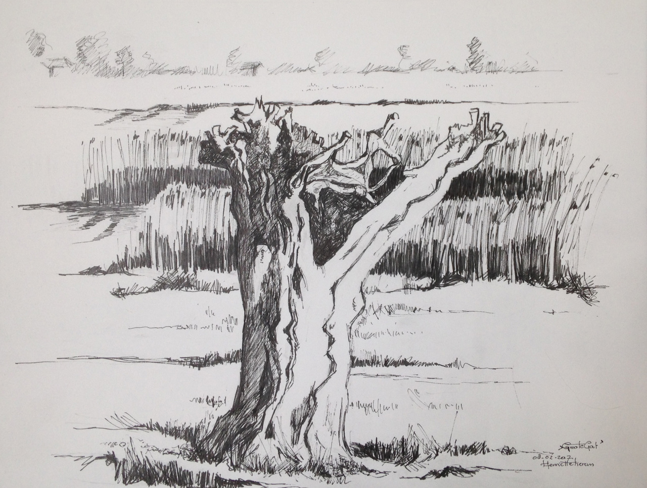 Knotwilg aan het natuurreservaat "Groote Gat" in Oostburg. Tekening in inkt.