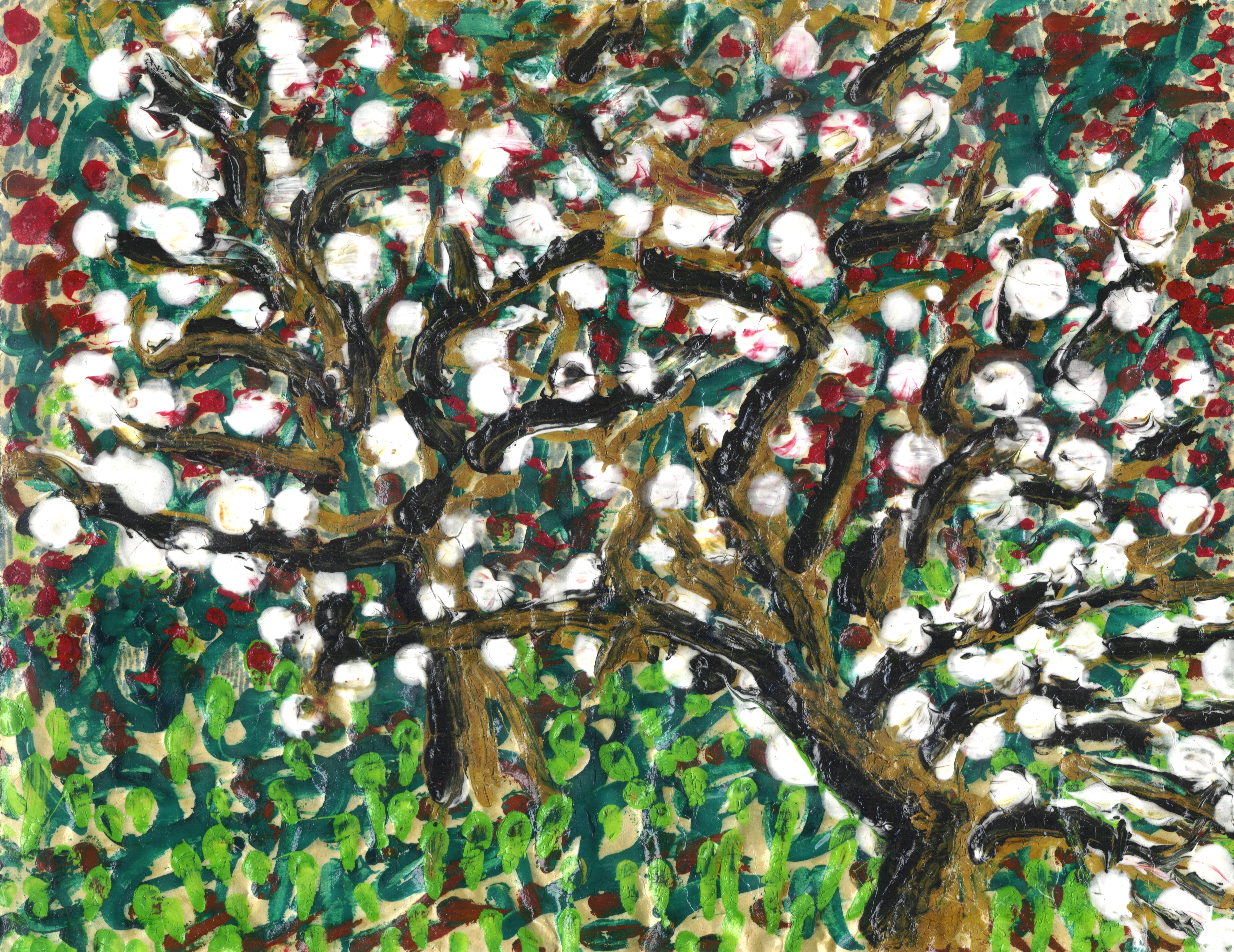 Witte bloesem van fruitbomen in de lente. Waterverf, plakkaatverf, stift, acryl op ruitjespapier.