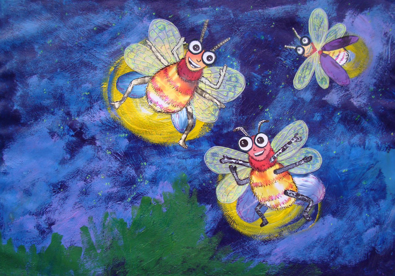 Knuffelkever en zijn vrienden. Hier dansen de vuurvliegjes met elkaar. Gemengde techniek van acryl op papier, tekenpen en collage.