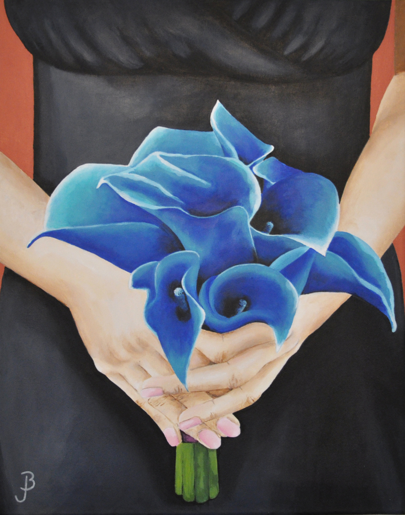 zwarte jurk, blauw boeket