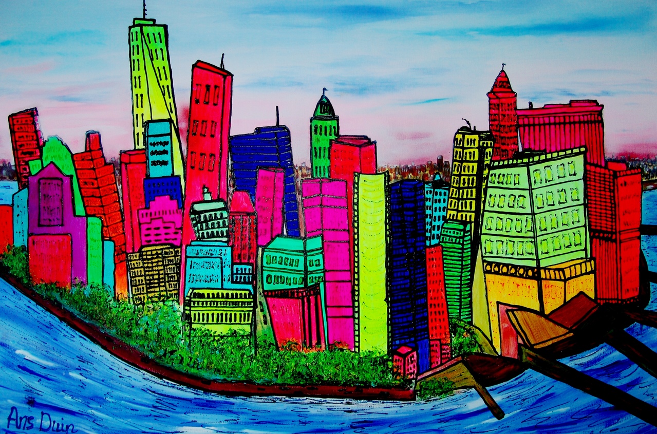 Schilderij Rood Oranje Geel Blauw Acryl Groen Kleurig Art Kleurrijk Kunst Lucht Lente Zomer Stad Gebouwen Summer Steden Eastern Spring Pasen Fluor Newyork Ansduin Goedevrijdag