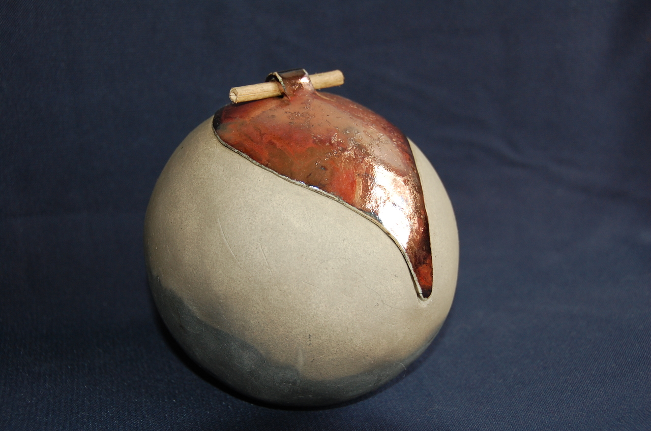 Raku.gestookte bol met koperen deksel en houten handvat. Ook van binnen prachtige kleuren koper.