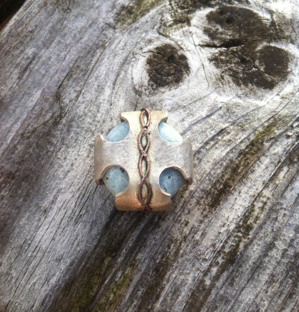 Een sieraad voor een prachtig, krachtige vrouw. Opdat zij zich haar schoonheid te allen tijde zal herinneren. Larimar in zilver, afgewerkt met roodkoper.