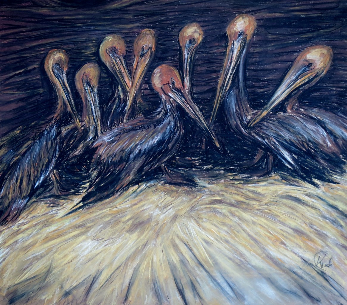 met olie besmeurde pelikanen in het opvangcentrum. tekening naar een winnende foto.