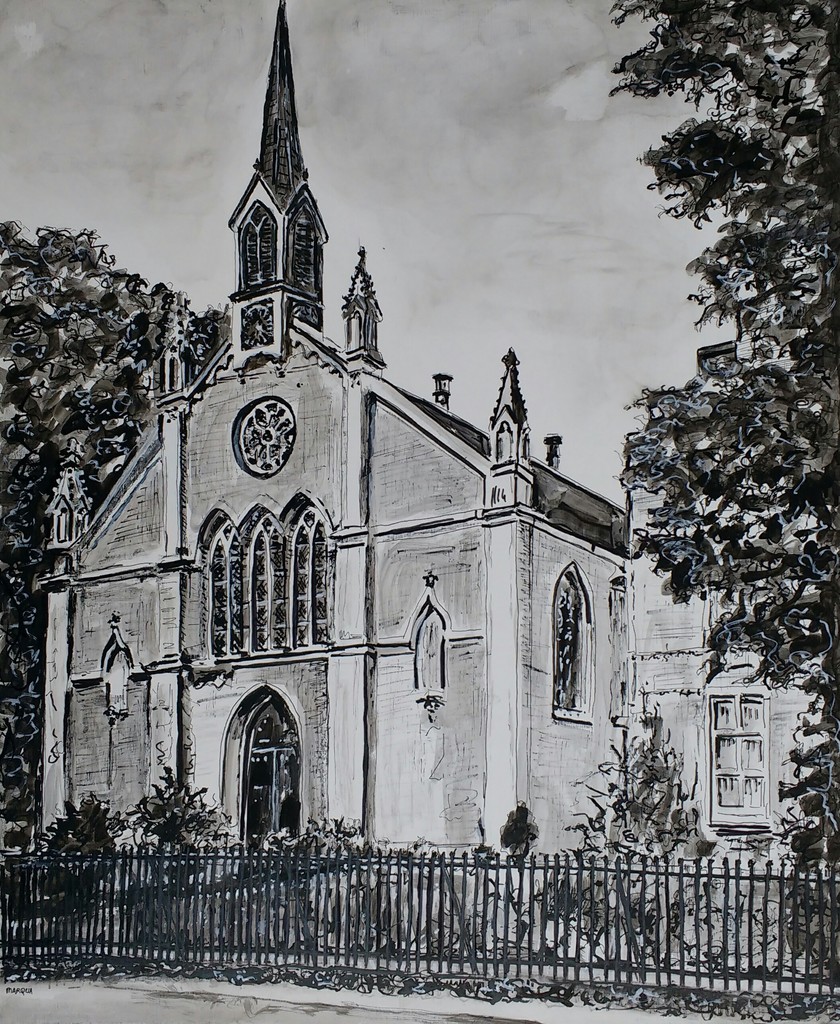 Kerk Zeist, in opdracht getekend en geschilderd in Oost-Indische inkt op paneel 47x57 cm.