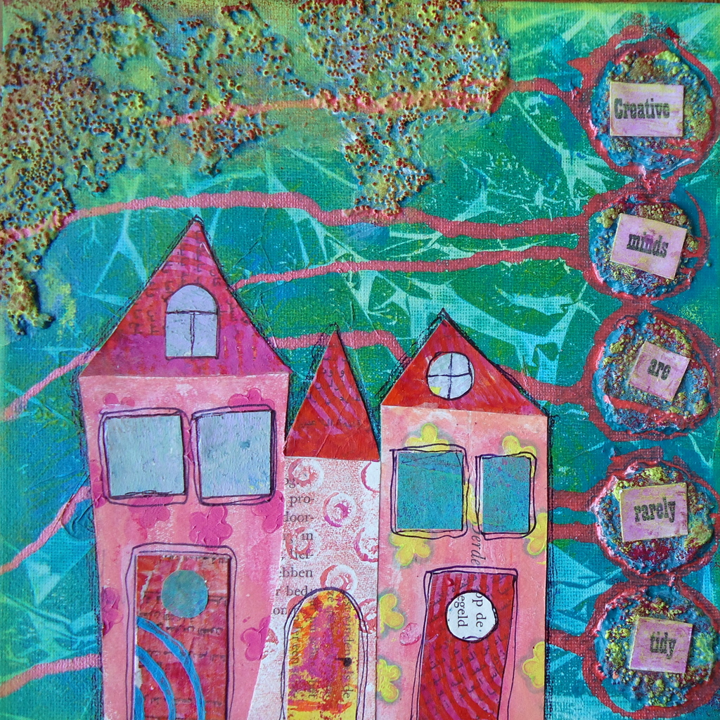 Collage met tekst op schilderdoek. Drie huizen samensgesteld uit verschilende soorten handbedrukt papier.