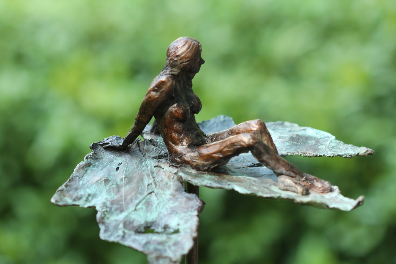 Een vrouw ontspannen op een blad. prachtig beeld voor in de tuin. De natuur speelt met het blad.