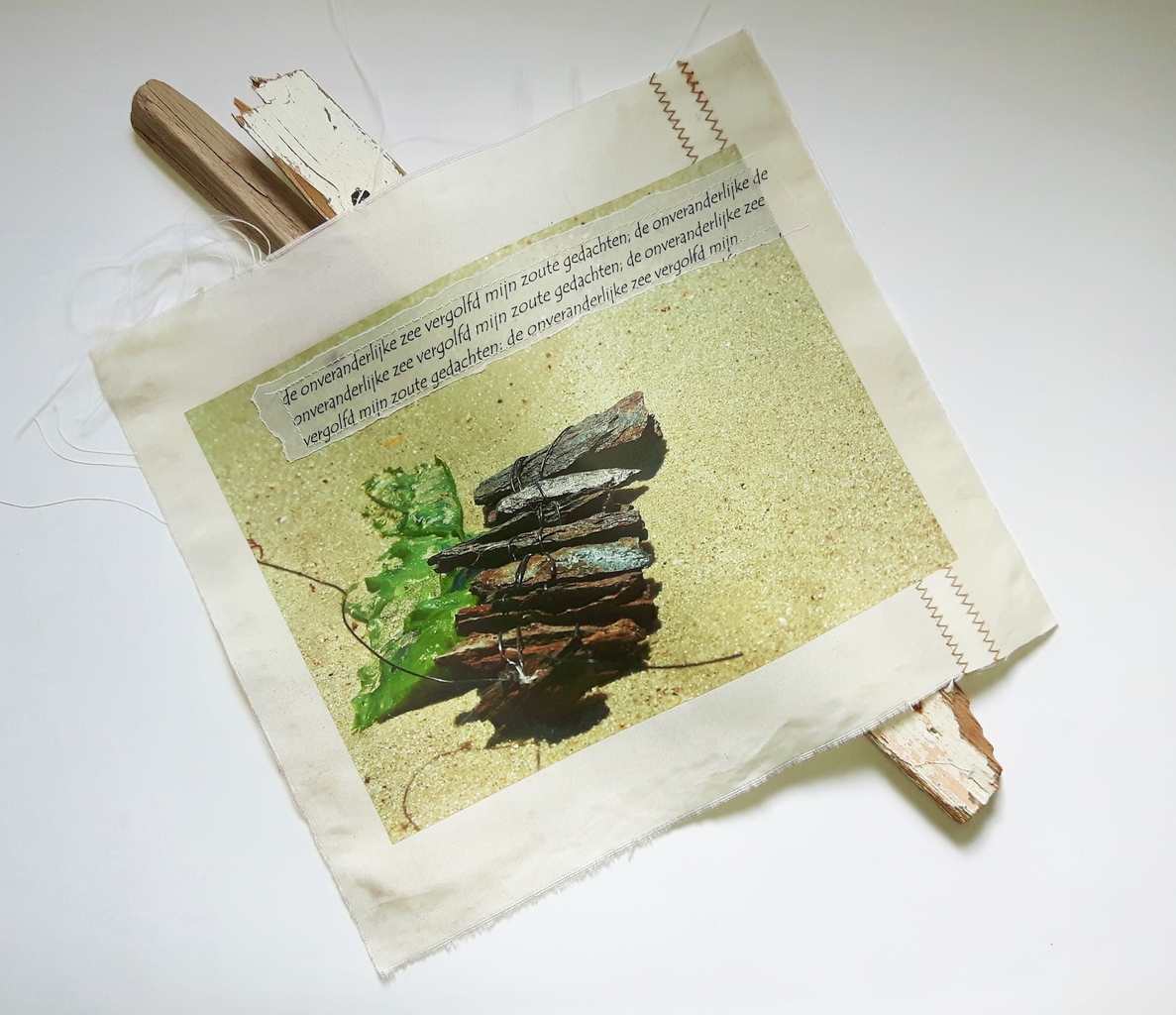 roest en visdraad gevonden aan de kust. Vervolgens geassembleerd en teruggebracht en gefotografeerd aan de kust. Afgedrukt op uitgezeild zeil