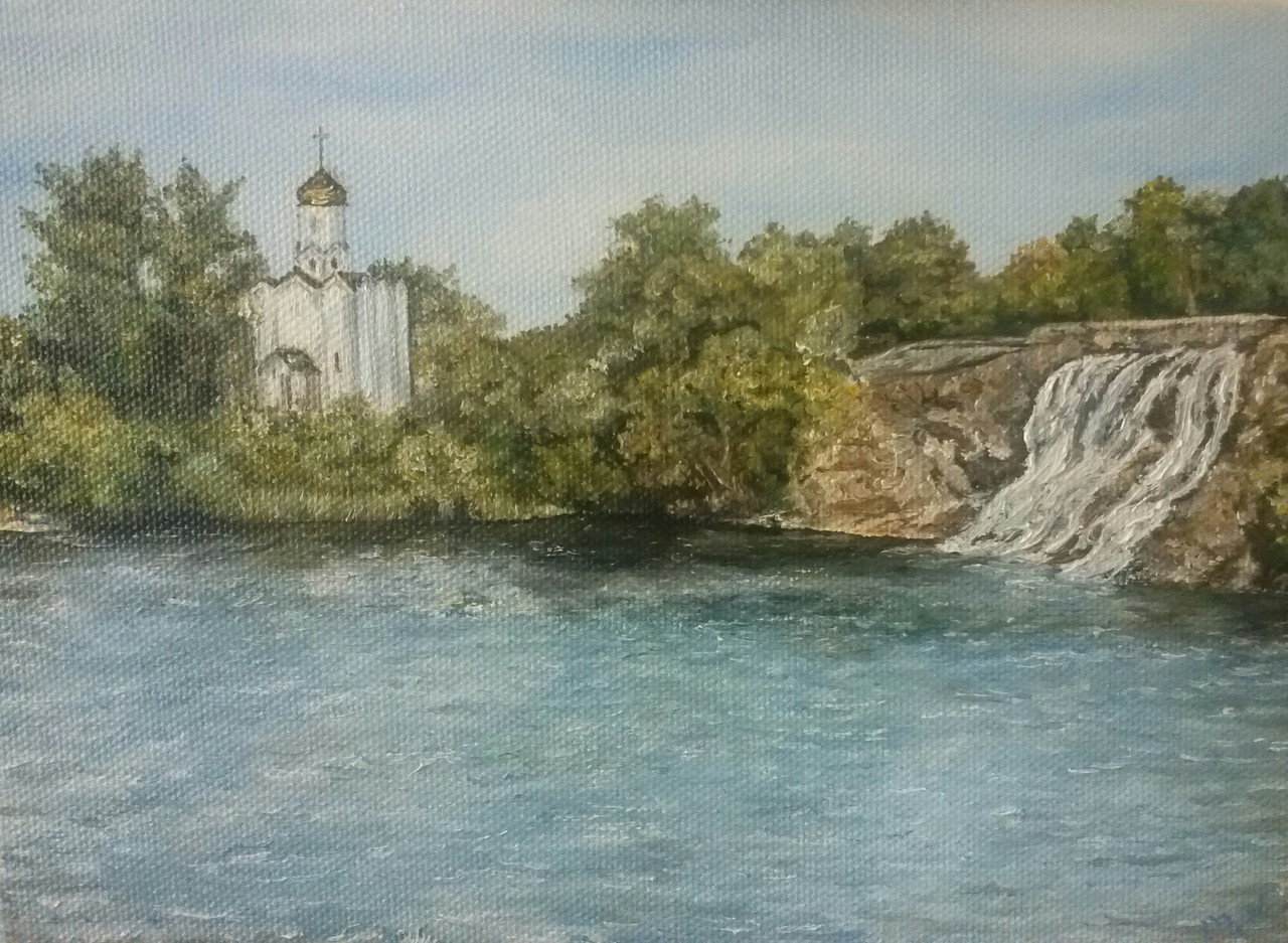 Bank in Dnepropretrovsk, Oekraïne en een waterval. Het blijft een uitdaging om water realistisch op een doek te schilderen, dus was deze schilderij interessant en een uitdaging voor mij. In het special omdat deze waterval naderhand is aangelegd
