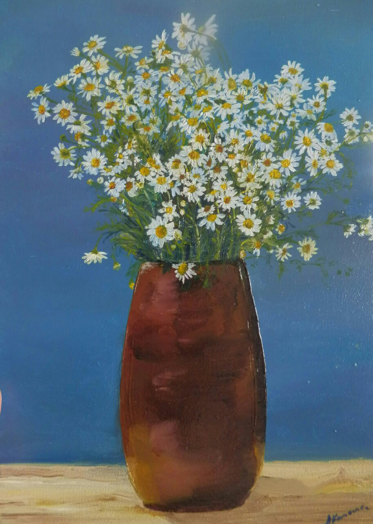 Een bosje kamille, deze heb ik als opdracht geschilderd. Naar een voorbeeld van een oude Sovjetse anzichtkaart