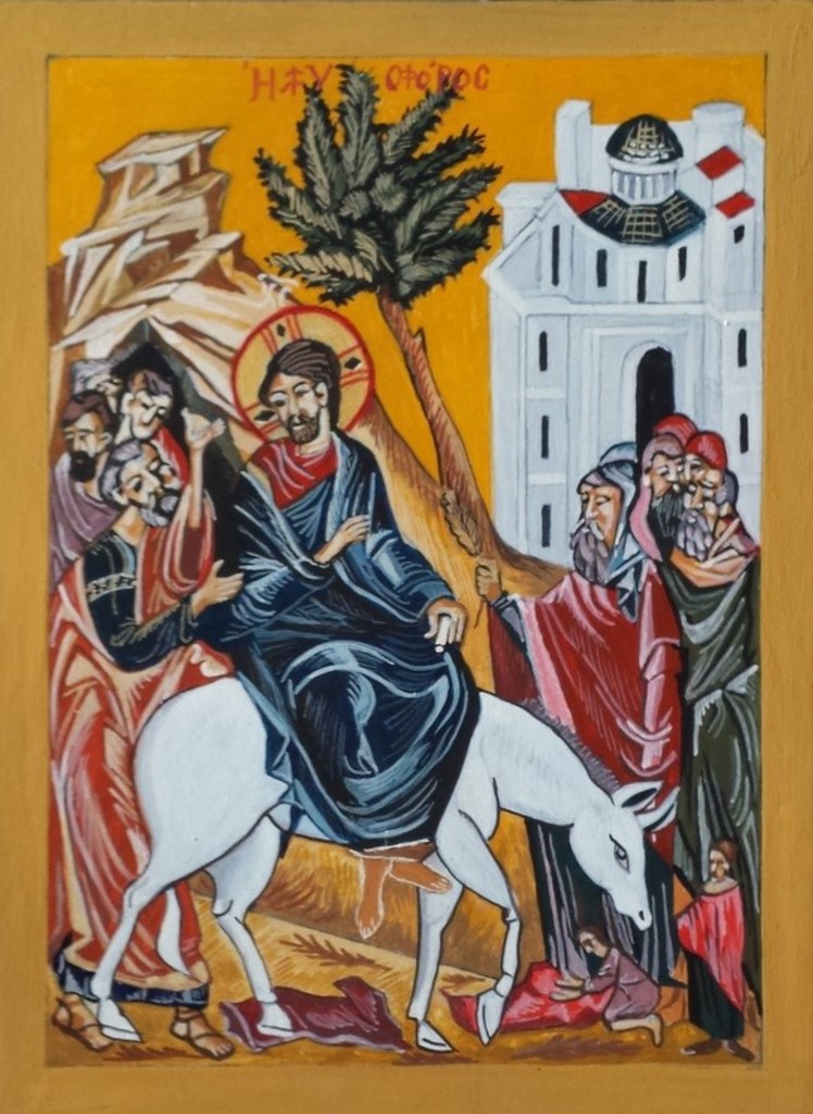 deze icoon geeft de intocht van Jezus in Jeruzalem weer. de mensen zijn uitgelopen om hem te begroeten.