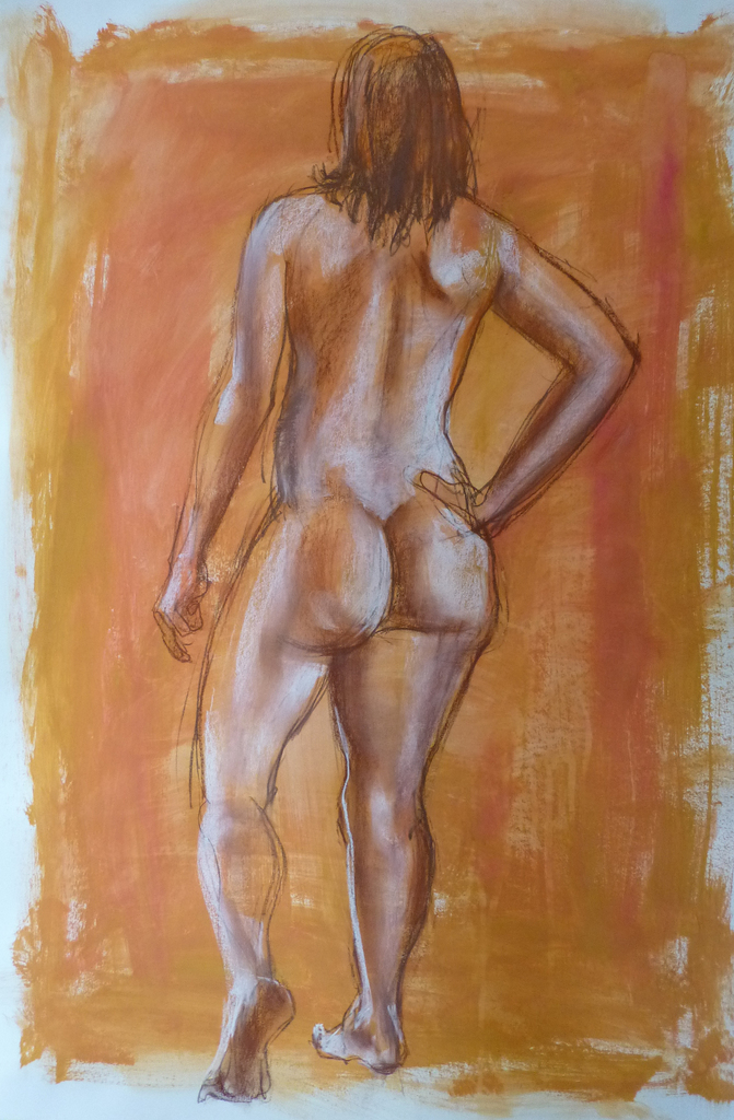 Combinatie van acryl achtergrond en pasteltekening in diverse licht en donker variaties. Live modelstudie bij Pieter Schmits - docent Cultuurhuis Wherelant