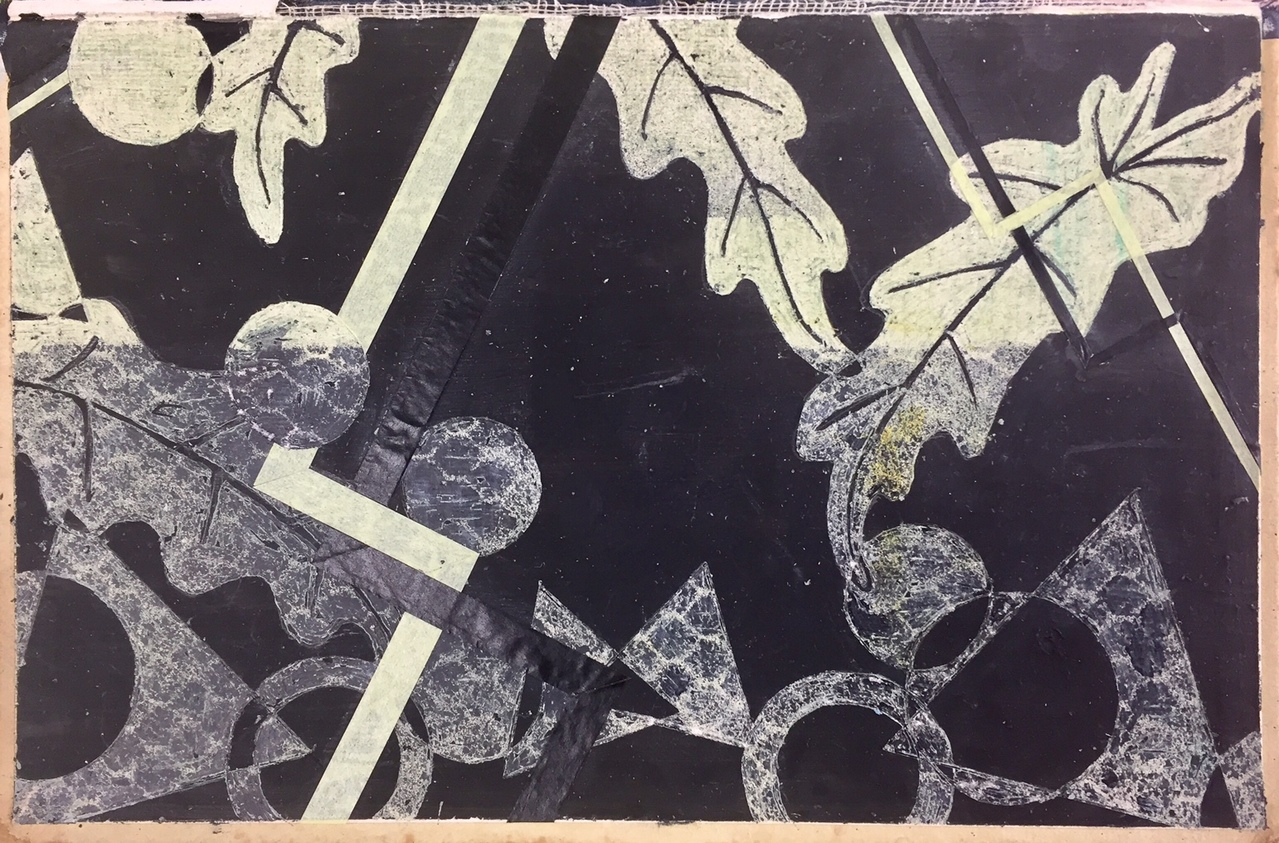 BOEKOMSLAG, spuitverf, oliepastel, tape, acryl