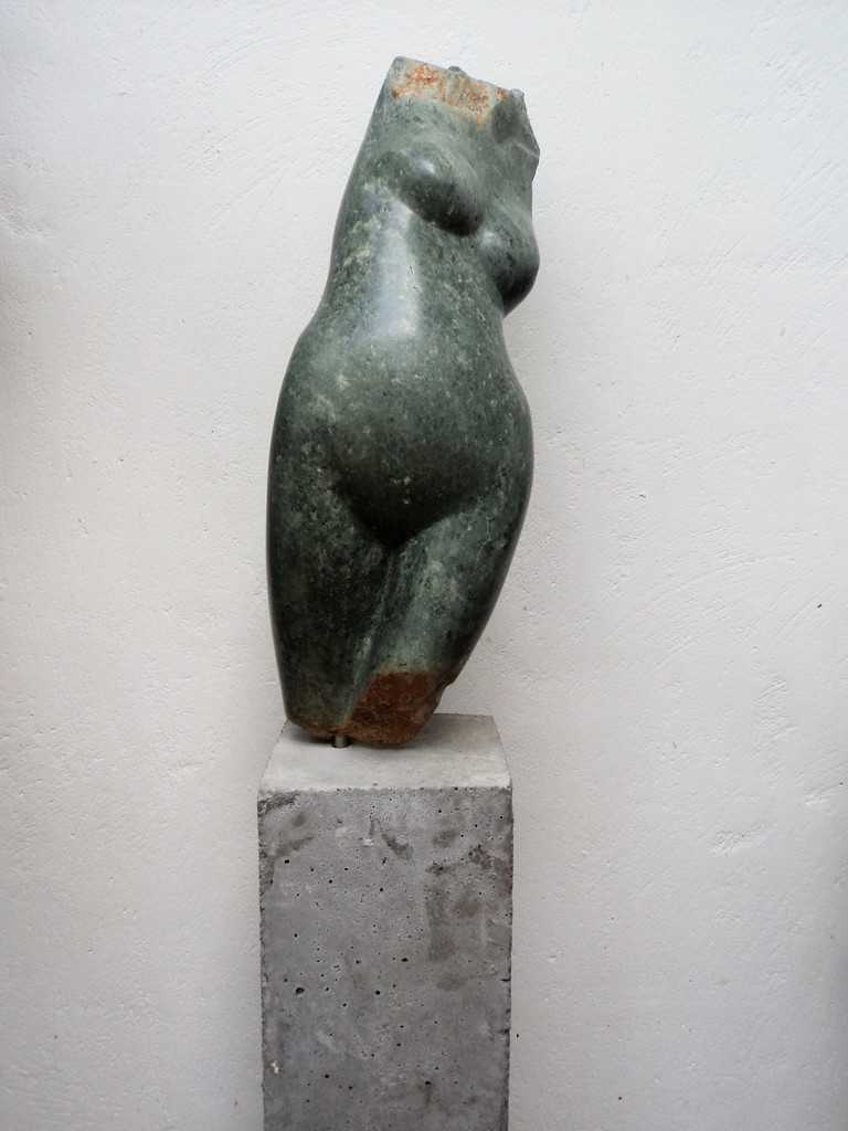 Torso van groene serpentijn. Aan de bovenkant is de steen ruw gelaten. Het beeld staat bij mij in de tuin. niet te koop.