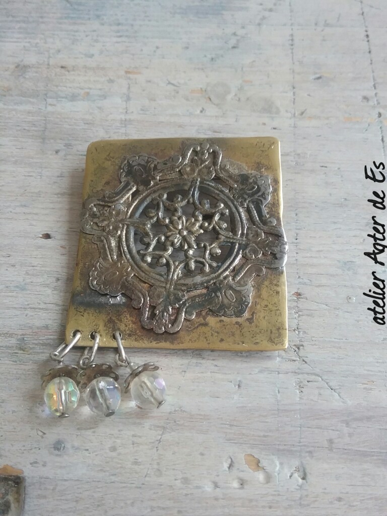Messing broche met versierselen van een kleine vlooienmarkt vondst