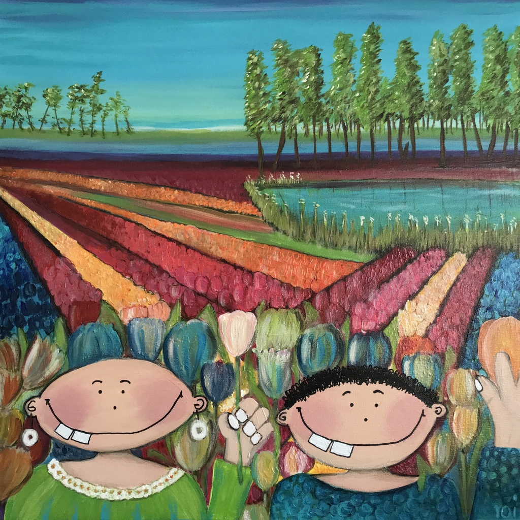 Familie Tandjes op bezoek in de Keukenhof. Gemengde techniek.