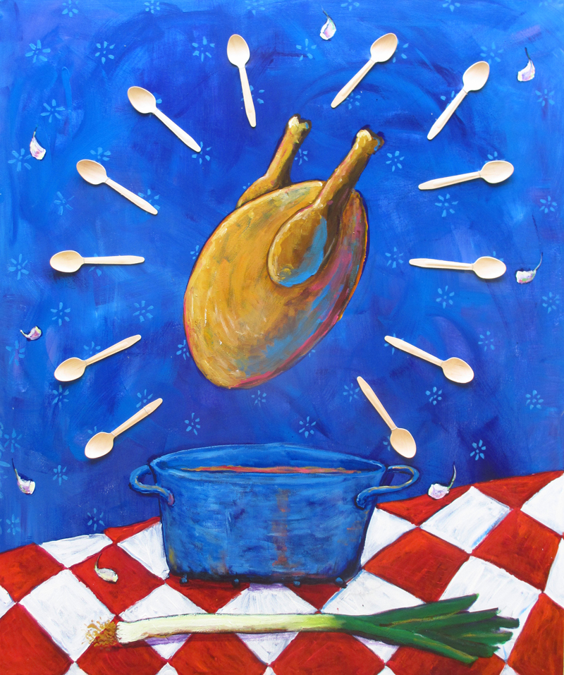 Op dit schilderij zitten houten lepels bevestigd, mixed media dus.