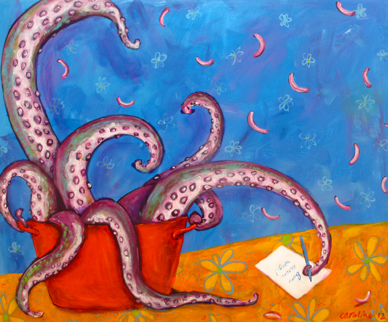 Caroline d'Hollosy schildert vrolijke schilderijen, van gedekte tafels in weelderige tuinen, met springende stoeltjes en spartelende vissen. Felle kleuren, mooie composities en humor spatten van het doek.