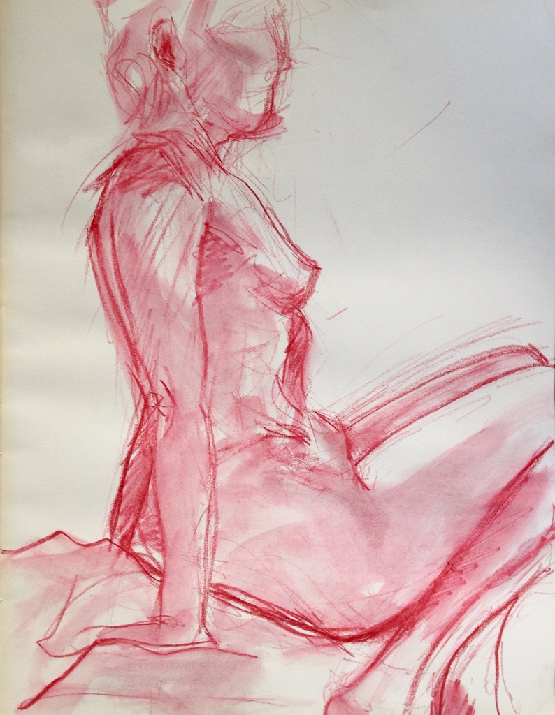 Zittend vrouwelijk naakt op kussen Rood inktense potlood op cremekleurig papier