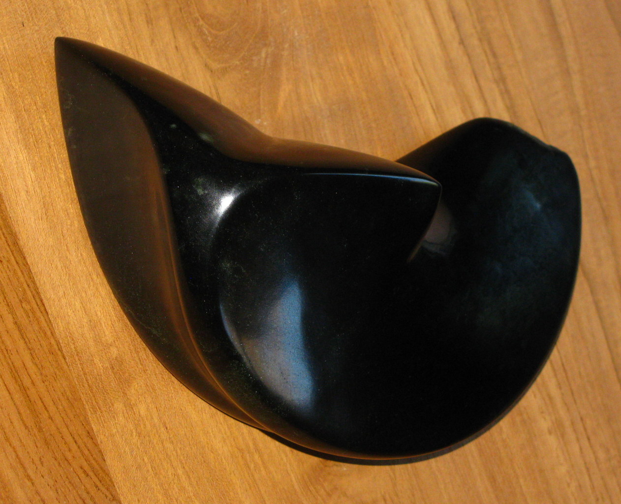 Gebaseerd op vorm en kracht van de staart van grote zeezoogdieren. Glimmend zwart, Sterk maar in rust. Uitgevoerd in Galastone.