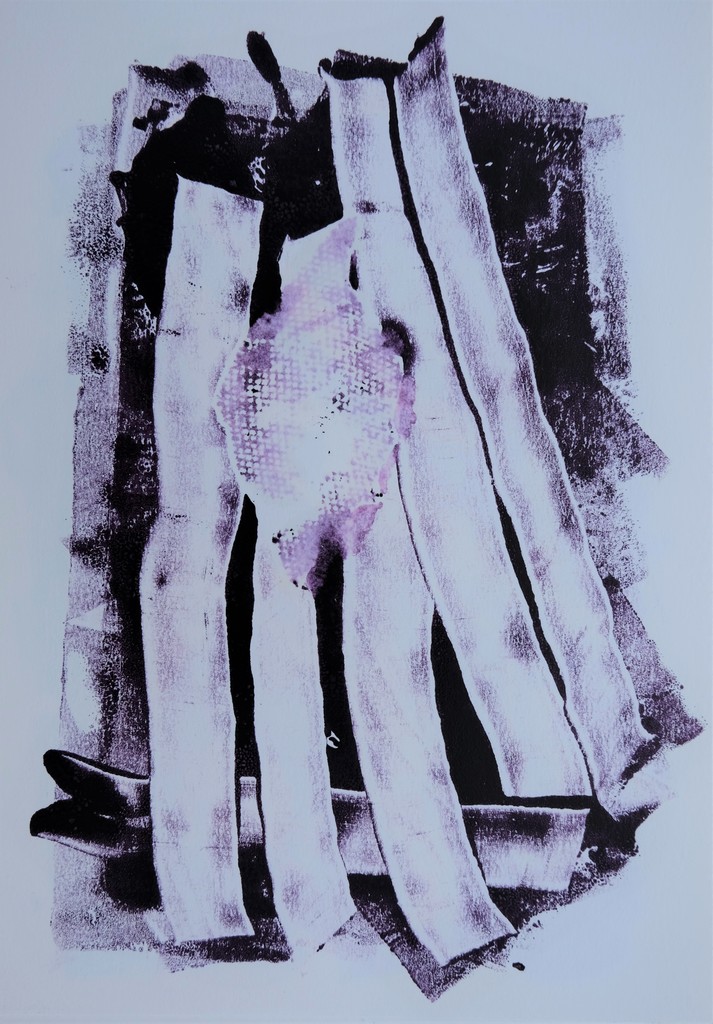 "Het kale feit / dat zes vingers dwars staan / op mijn duim / moet niet gezien worden / als symbolisch." monoprint (1/1)