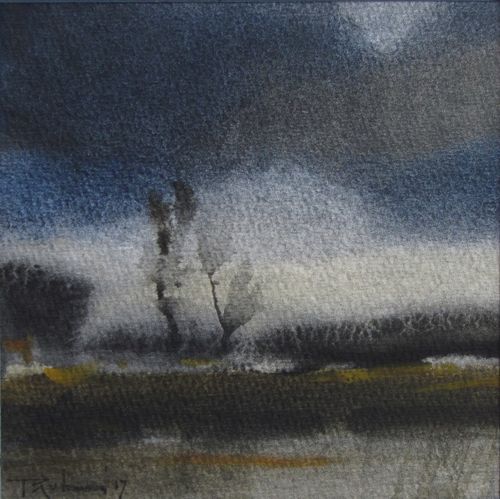 Klein Water Bomen Regen Riet Waterverf Biesbosch Stemmig