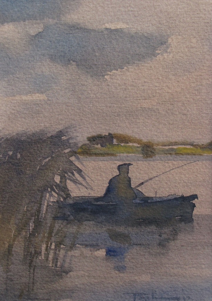 Roeiboot met visser in het riet. Ingelijst 40 x 30 cm.