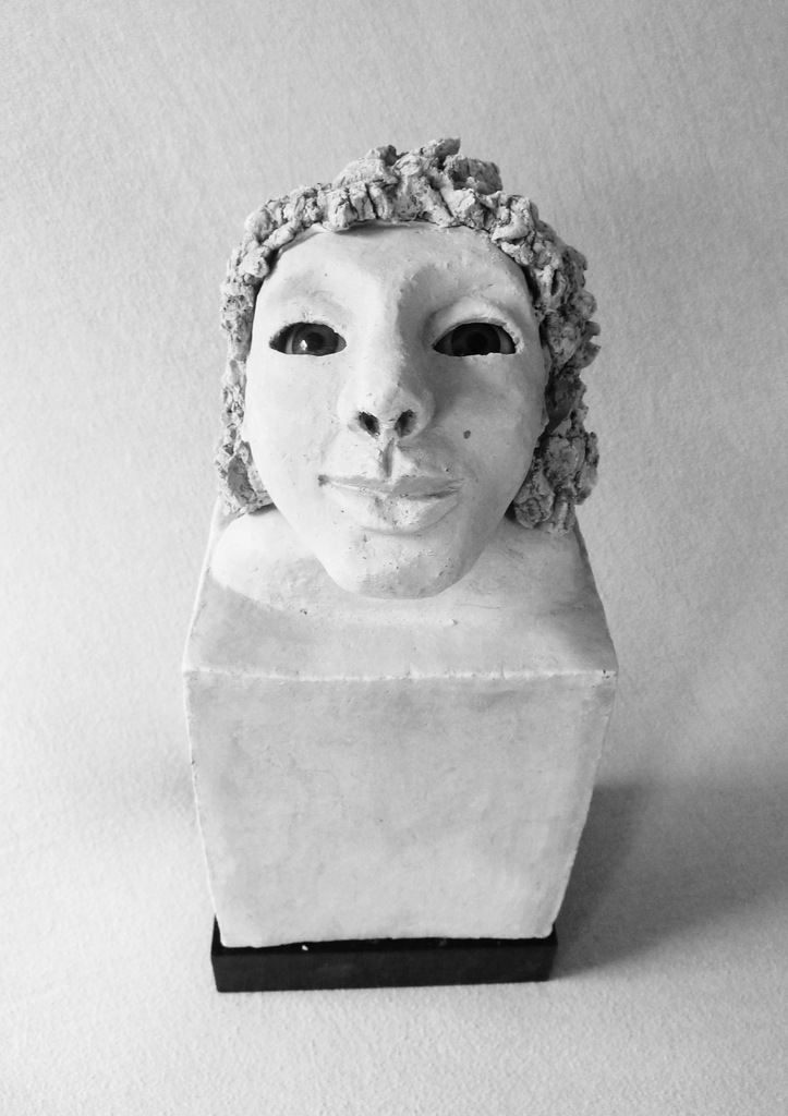 Meisjeskopje van grijze klei met antieke blauwe poppenogen.