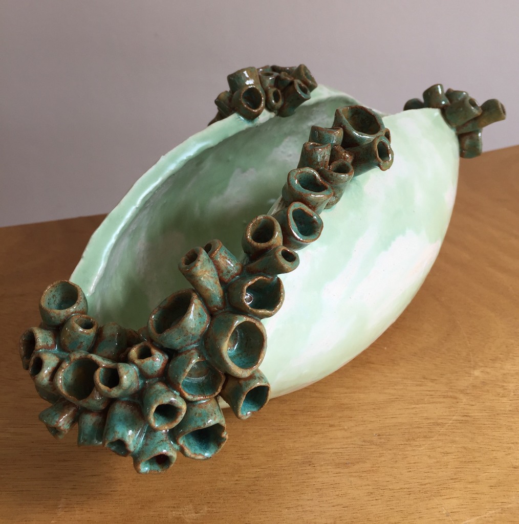 Keramiek, ovaalvormige schaal opgebouwd met verschillende kleisoorten, geglazuurd