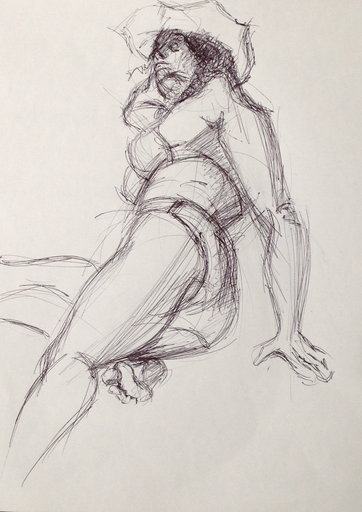 Model Jacqueline, uitrusten aan het strand. Direct getekend met fine-liner.Werk is in particulier bezit.