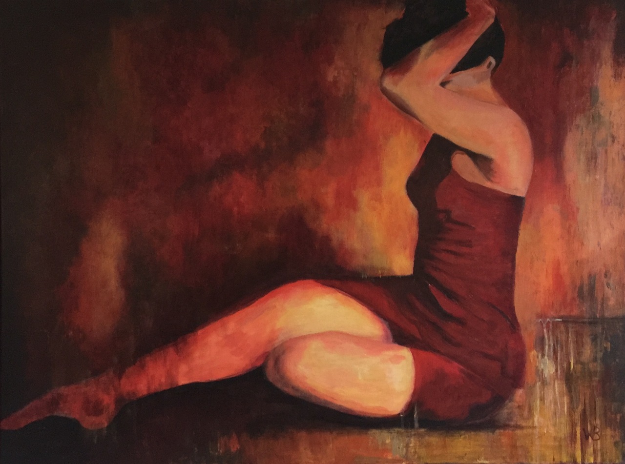 Deze vrouw is in olieverf geschilderd met kwast op doek. Dit schilderij zit in een dieprode baklijst en is br.h. 80- 60 cm