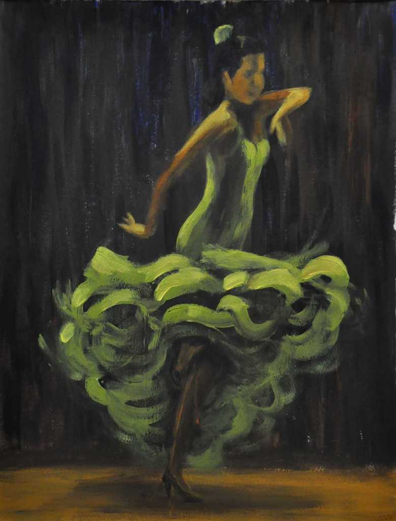 Figuratief Zwart Acryl Groen Papier Green Black Paper Danseres Flamenco Expressionistisch Dancer