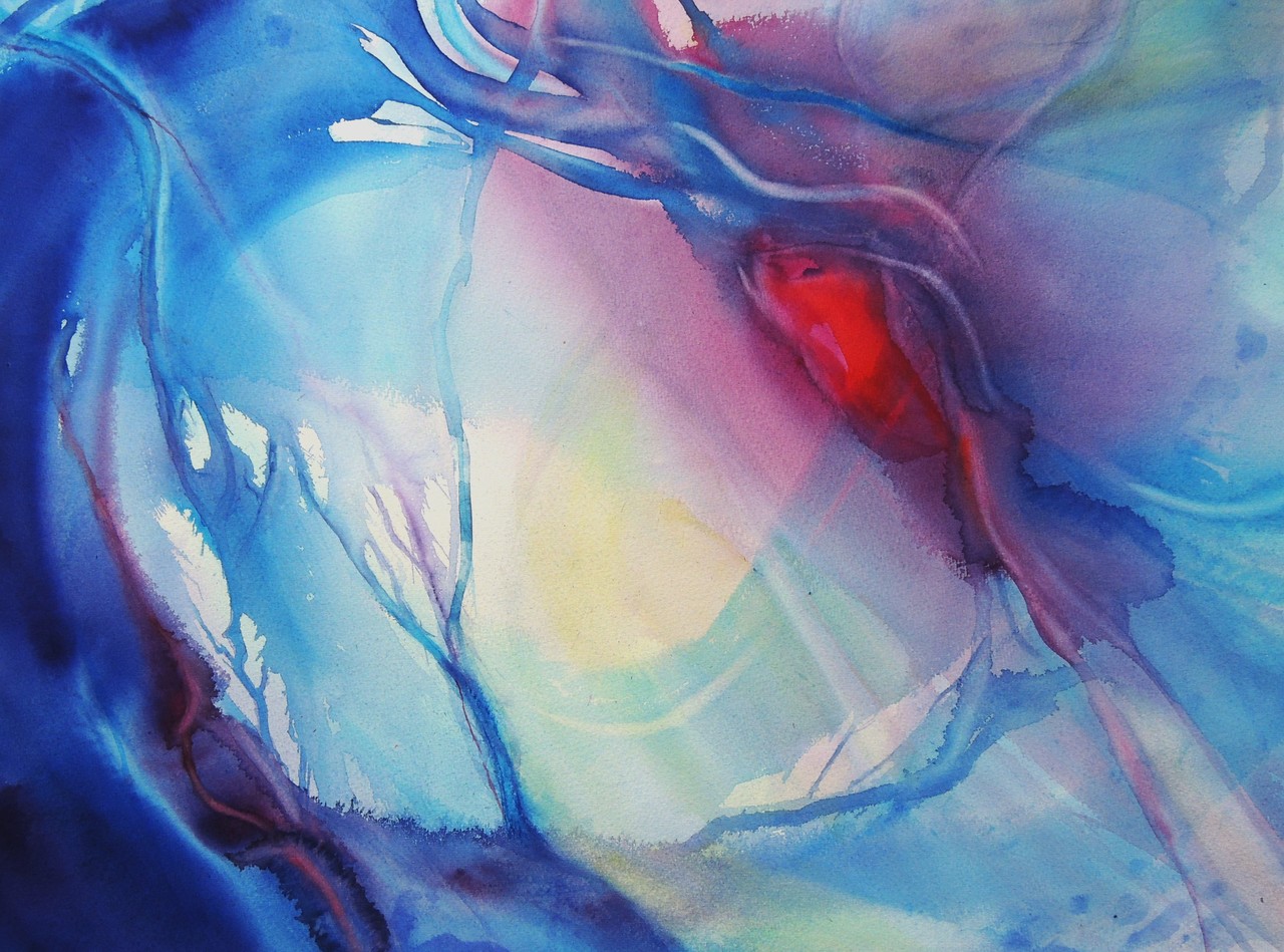 Vanuit de vrije fantasie is dit werk gemaakt. Uitgangspunten waren de kleur blauw en lichtinval, de vis in het water is al werkend spontaan ontstaan.