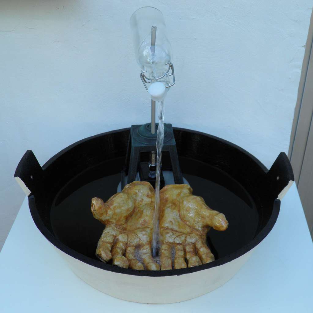 Water stroomt uit de fles om de handen te wassen in een wastobbe.