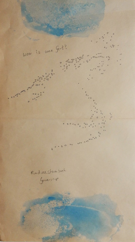 Aquarelverf en potlood op courantpapier.