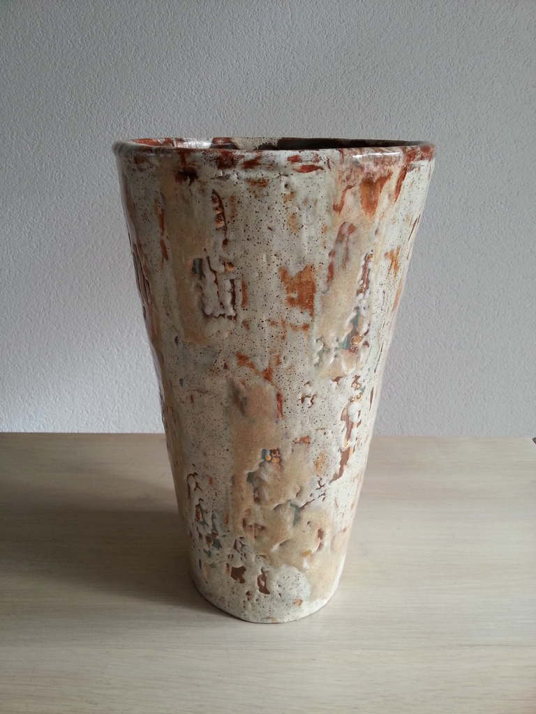 Hoge licht gekleurde vaas, rode klei en hoog gestookt (1200 gr). diverse glazuren en kleuren over elkaar heen gezet. Afgewerkt met goudglazuur