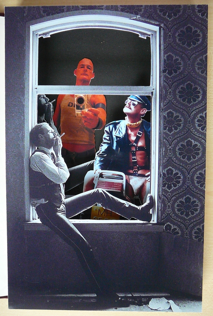 Venster waarin een figuur zit. Achter venster twee andere figuren in leer.