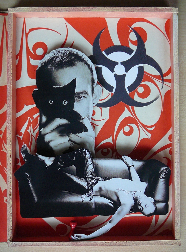 man met kat, man op bank en biohazard teken op achtergrond boekdoos 3D