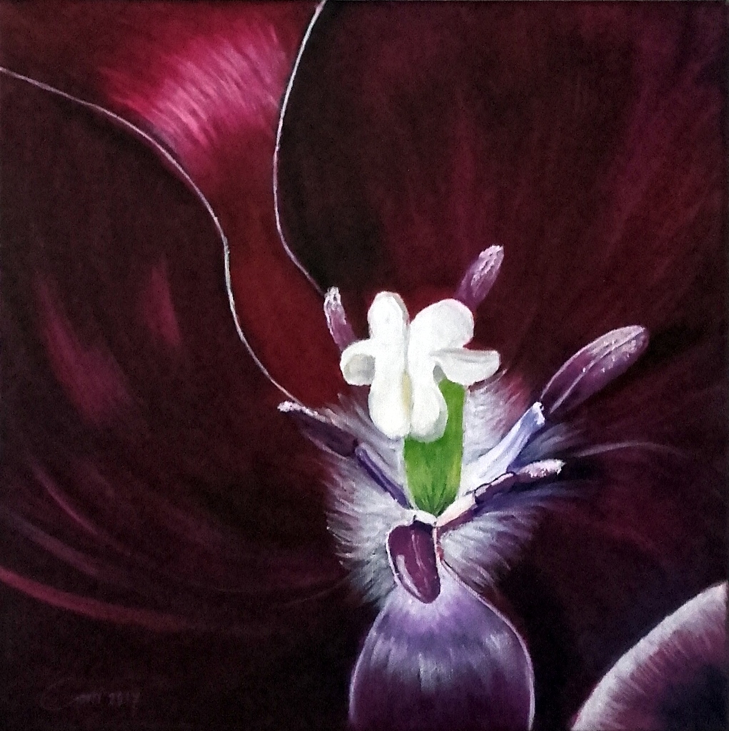 de binnenkant van een tulp met meeldraden en stamper ingelijst