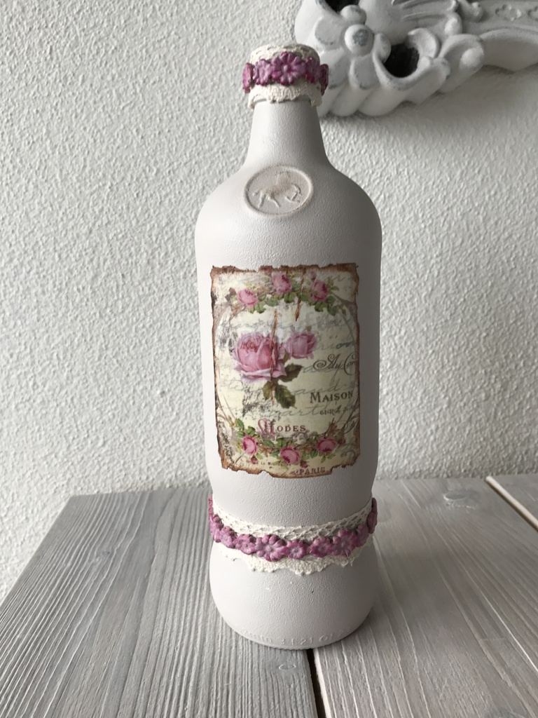 glazen fles getransformeerd, acryl, klei, papier, kant.