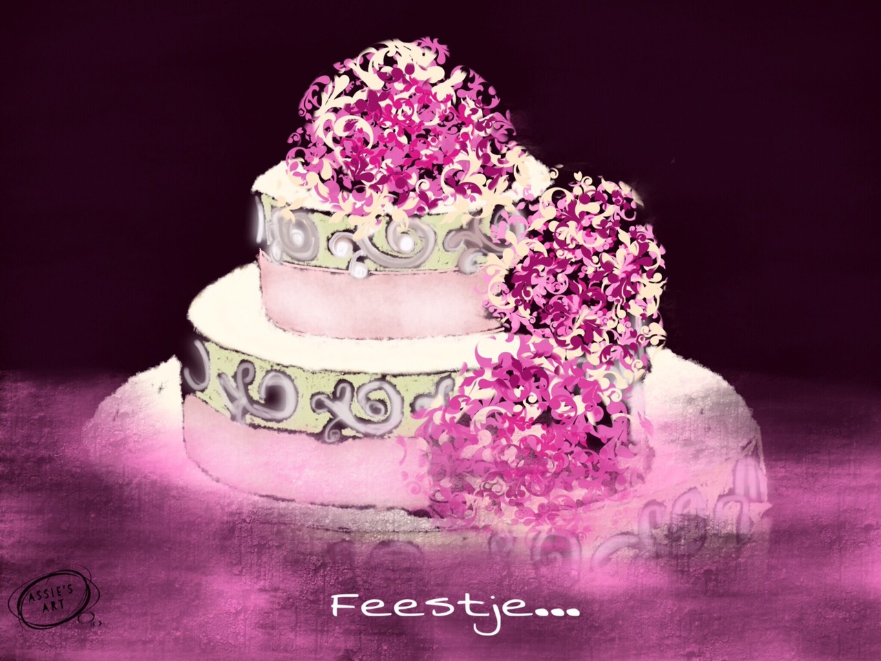 Flowers Feest Feestje Gebak Taart Rose Wit Bloemen Tekening Digitaal Kunstkaarten Roze Party Cake Pastry Whipped Cream Drawing Digital Illustration Illustratie