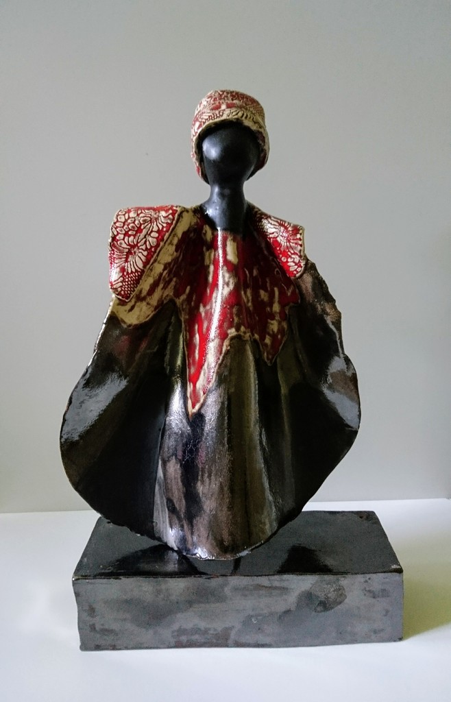 Een vrouw in de wind op sokkel van keramiek. Gezicht is mat zwart, de 'kleding' is zwart spiegel, mat zwart en rood wit. Ook de tulband is rood wit. Het kant dat gebruikt is voor de tulbant en de sjaal is goed zichtbaar door de glazuur. De sokkel is zwart spiegel.