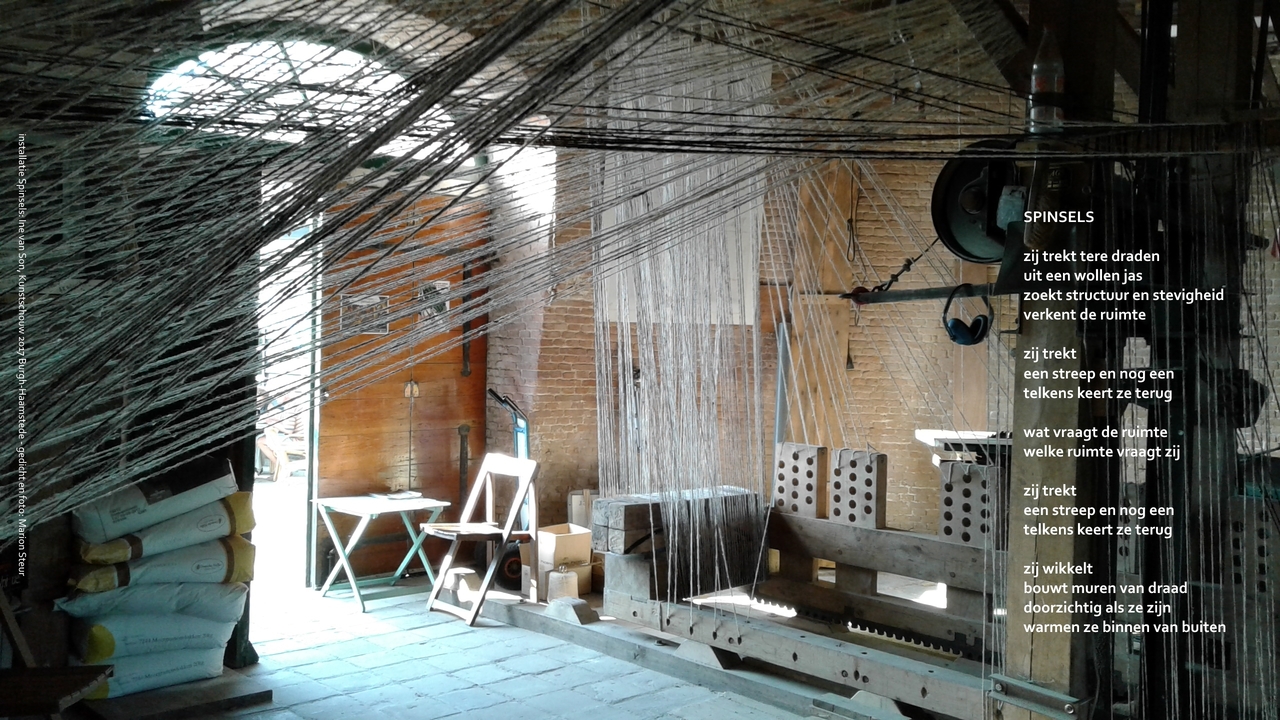 Tijdens de Kunstschouw 2017 maakte Ine van Son de installatie Spinsels in de Pannekoekenmolen in Burgh-Haamstede. Van zelf gesponnen schapenwol haakte ze draad, veel draad, waarmee ze de molen transformeerde. De transparante indeling in verbonden deelruimtes liet de bezoekers dwalen in verwondering. Een paar uur in en om de installatie bracht mij een gedicht.