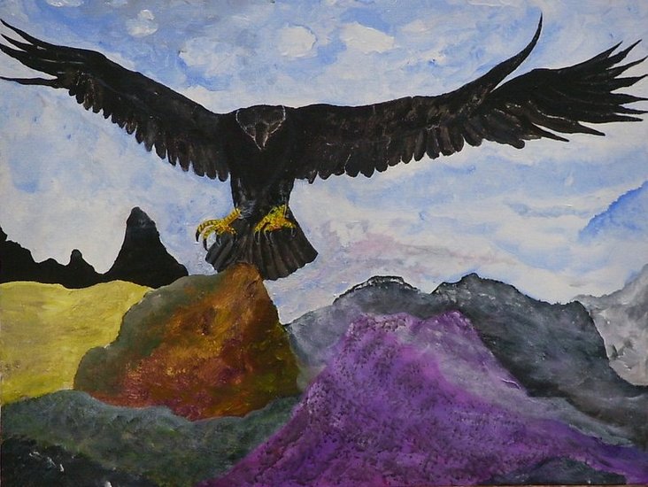 Alleen de arend is licht geschetst op doek, de rest is er spontaan bij gekomen