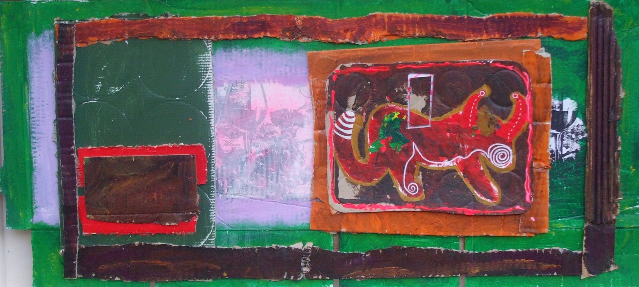 Feest Stier, acrylverf / collage op gerecyceld karton, in houten baklijst